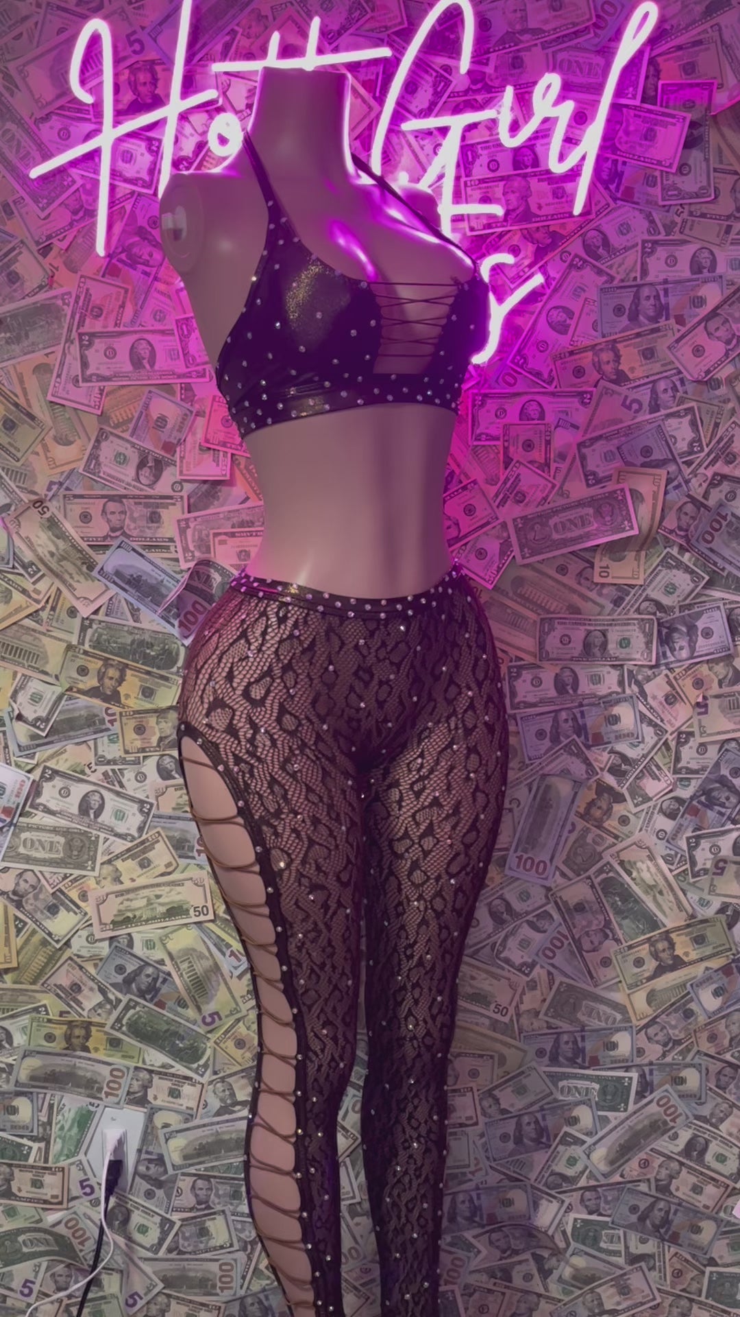 1pc: fully customized lace up legs fishnet jumper with XL stones. 1 size fits most