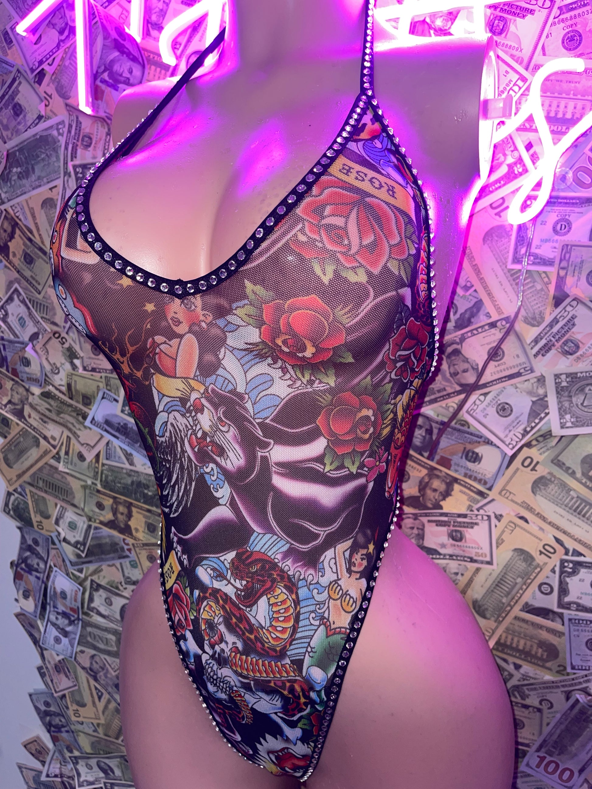1pc: mesh inspired bodysuit outlined in white crystals, crotch is double lined (not see through) osfm